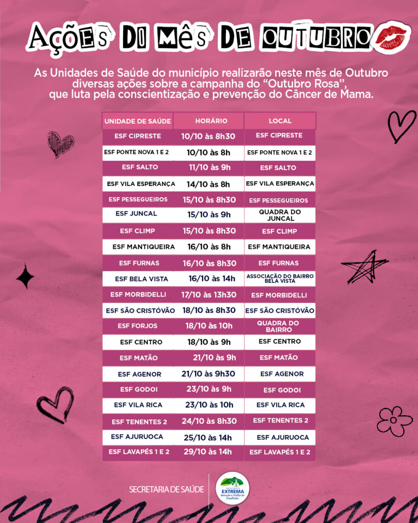 Durante todo o mês de outubro, a Prefeitura de Extrema, por meio da Secretaria Municipal de Saúde, promove a campanha Outubro Rosa para a conscientização e prevenção contra o câncer de mama. A programação é composta por palestras e outras ações educativas acerca da temática, realizadas nas ESFs da cidade. As mulheres interessadas devem comparecer aos locais e horários indicados na divulgação.
